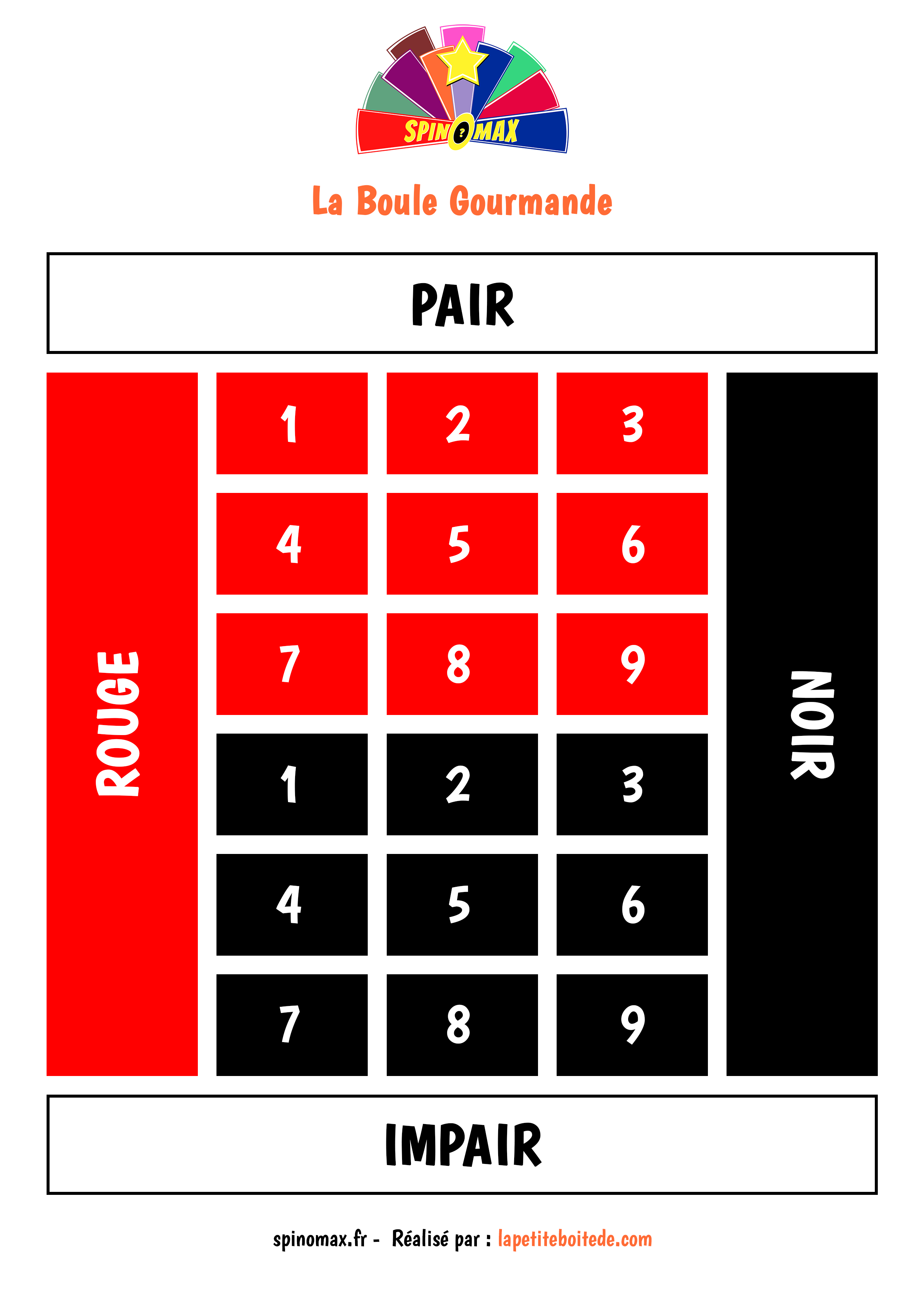 Le Pari de Genre (Pair ou Impair) : Si vous tombez sur un chiffre du même type que votre mise (pair ou impair) : Vous récupérez votre mise X 2.(Exemple : Vous misez 1 bonbons sur IMPAIR et c'est le 7 NOIR qui gagne, vous en récupérez 2). 🔴/⚫ Le Pari de Couleur (Rouge ou Noir) : Si vous tombez sur la couleur de votre mise : Vous récupérez votre mise X 2.